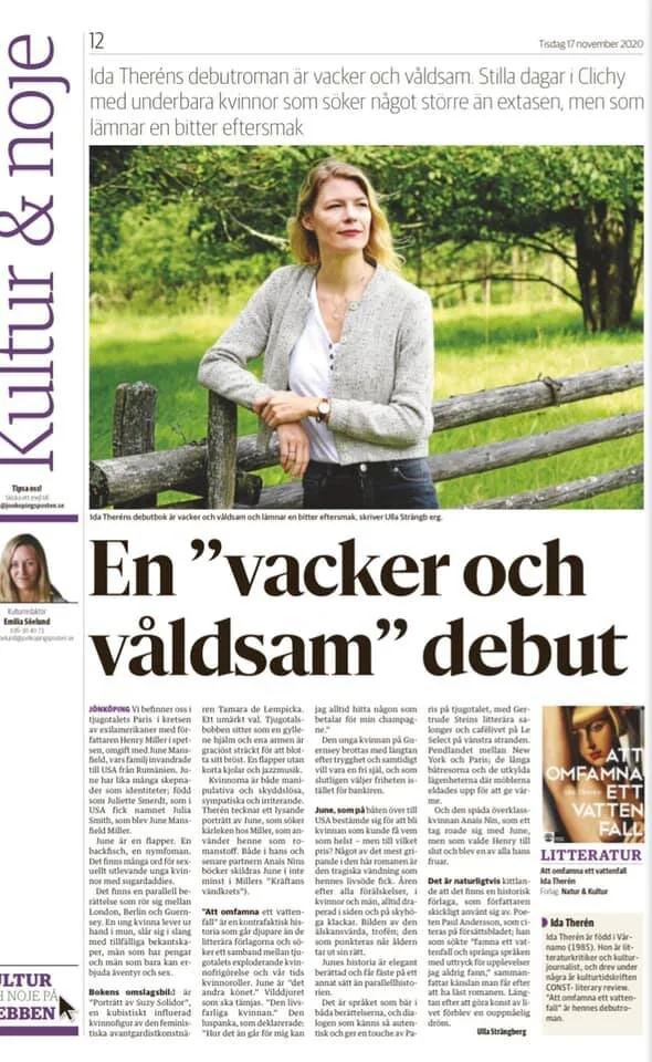 Bokrecension av "Att omfamna ett vattenfall" i Jönköpings-Posten (17 nov 2020)